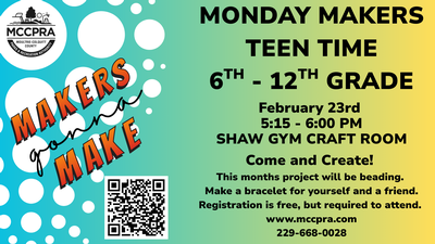 The Moultrie-Colquitt County Parks & Recreation Authority (MCCPRA) invites students in 6th–12th grade to participate in Monday Makers: Teen Time, a creative, hands-on program designed for teens.